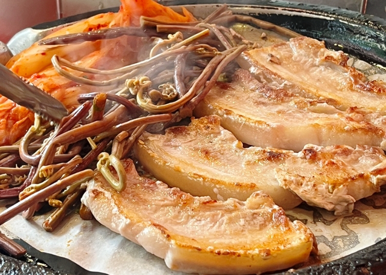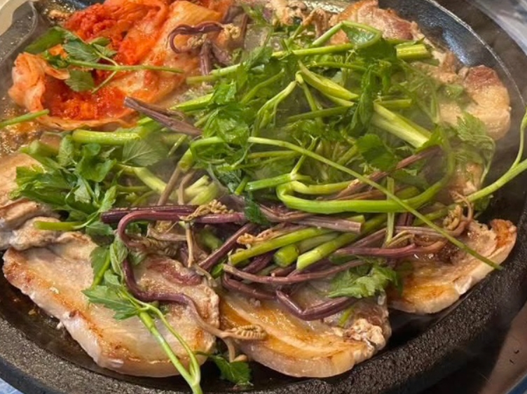 대표 메뉴는 삼겹살이다. 두툼하게 썰린 고기를 미나리, 고사리, 김치, 팽이버섯과 함께 불판에 올려 구워 먹는 방식이 특징이다. 고기에서 나온 기름이 채소와 어우러지며 깊고 고소한 맛을 낸다.