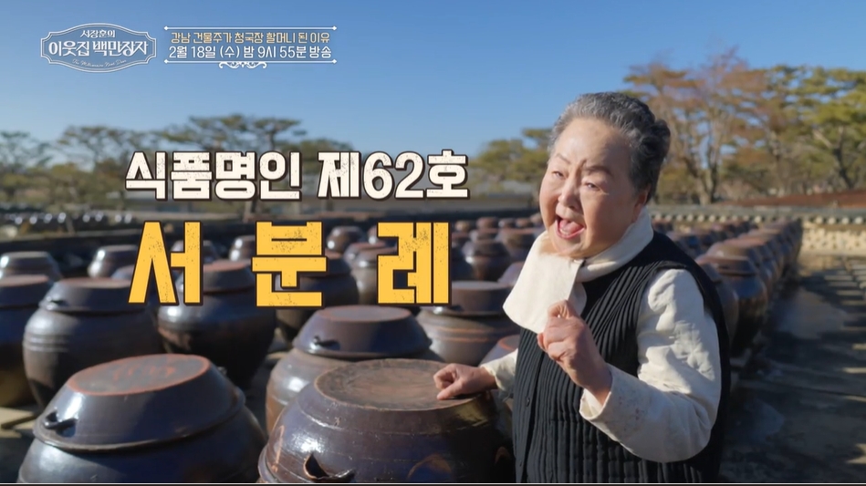이번 방송에서는 서장훈과 장예원이 경기도 안성에 위치한 서분례 명인의 농원을 직접 찾는다. 약 3만 평에 달하는 넓은 부지에 3천 개가 넘는 장독이 가지런히 놓인 풍경은 그 자체로 하나의 장관이다.