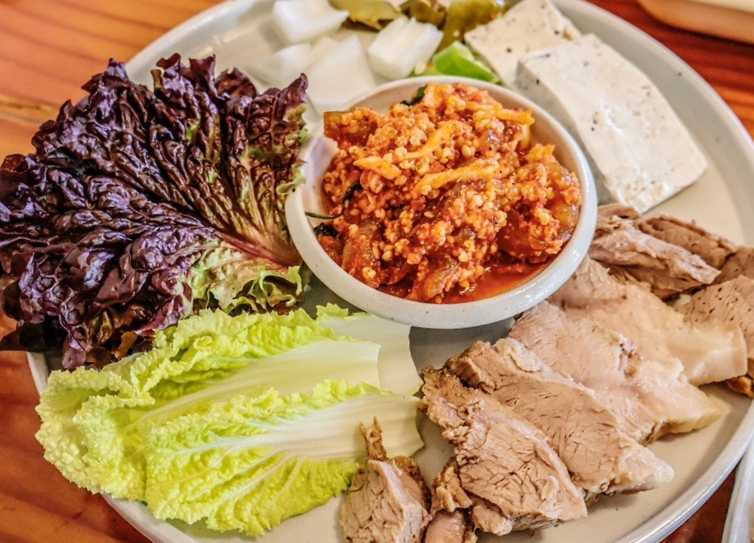 여기에 부드럽게 삶아낸 수육이 더해지면 두부와 가자미식해, 수육이 어우러진 두부삼합이 완성된다. 서로 다른 맛과 식감이 조화를 이루며 색다른 풍미를 만들어내는 것이 특징이다.