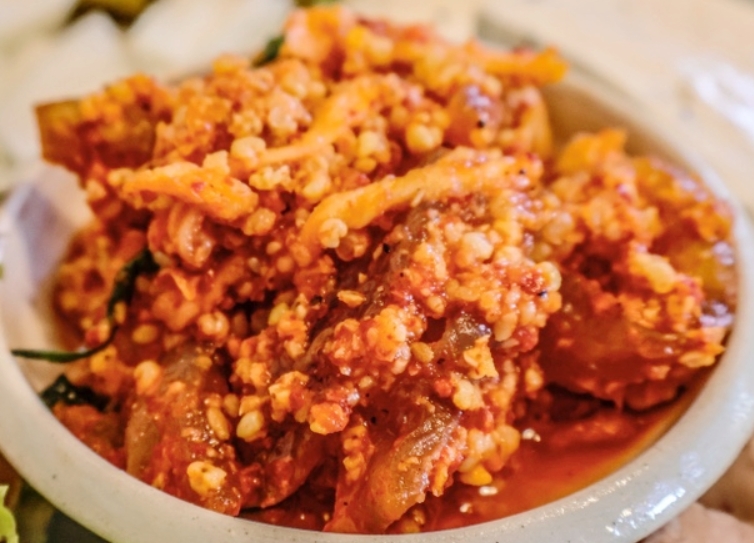 두부삼합을 이루는 재료 역시 경주의 지역색을 잘 보여준다. 먼저 경주 특산물인 가자미로 만든 가자미식해가 함께 곁들여진다. 발효 과정을 거친 가자미식해는 특유의 감칠맛이 살아 있어 담백한 두부와 잘 어울린다.