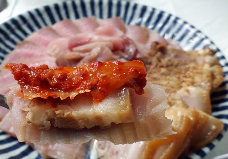 이렇게 잘 숙성된 홍어에 삶은 돼지고기 수육과 푹 익은 묵은지를 함께 곁들이면 홍어삼합이 완성된다. 홍어의 톡 쏘는 향과 수육의 고소함, 묵은지의 시원한 맛이 어우러지면서 독특한 풍미를 만들어낸다.