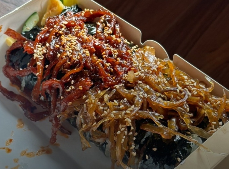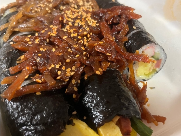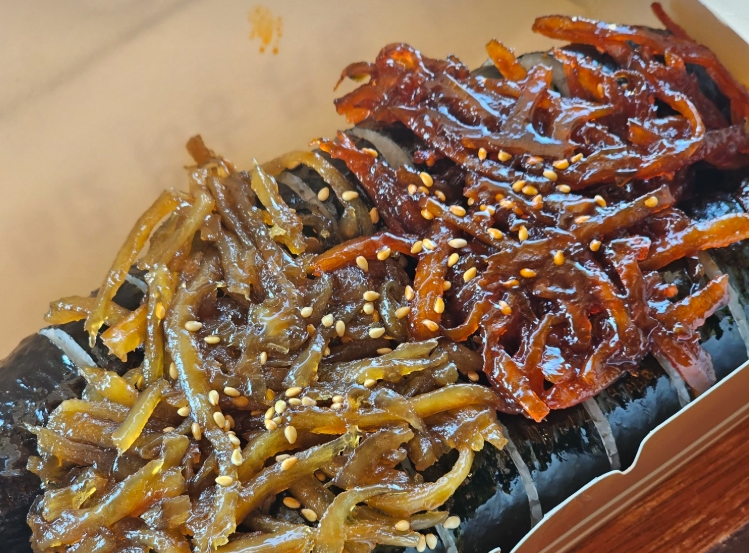일반적인 김밥보다 훨씬 푸짐하게 들어가는 우엉은 달콤하면서도 은은한 향을 더해 김밥의 맛을 더욱 깊게 만든다. 밥의 담백함과 우엉의 고소한 맛이 자연스럽게 어우러지면서 씹을수록 풍부한 맛을 느낄 수 있다. 특히 산처럼 풍성하게 쌓인 우엉채는 김밥의 단면을 더욱 먹음직스럽게 만들어 시각적인 만족감까지 더해준다.