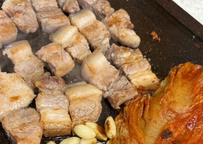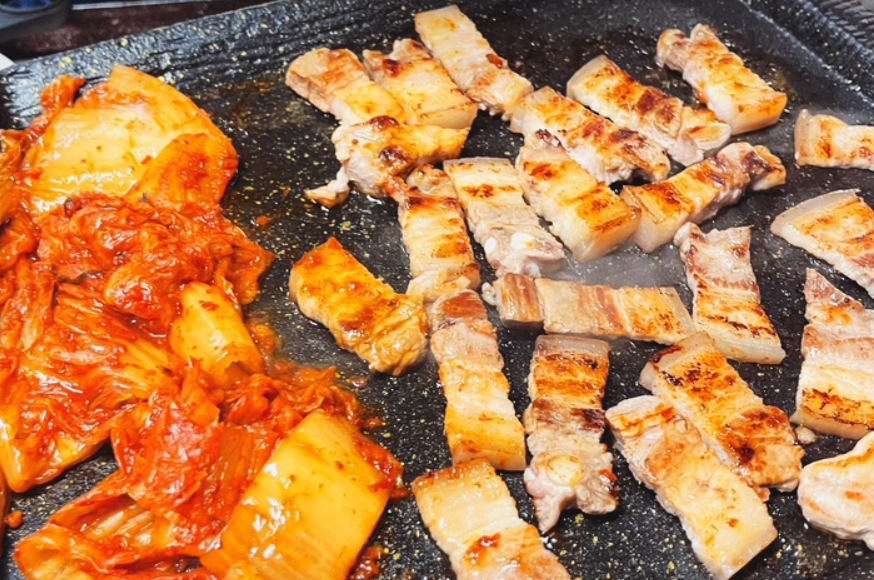 불판 위에서 고기와 묵은지를 함께 구워 먹으면 과한 양념 없이도 계속 손이 가는 조합이 완성된다.